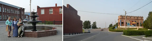 | Фонтанчик перед мостом на площади у комбината. Въезд на дамбу |